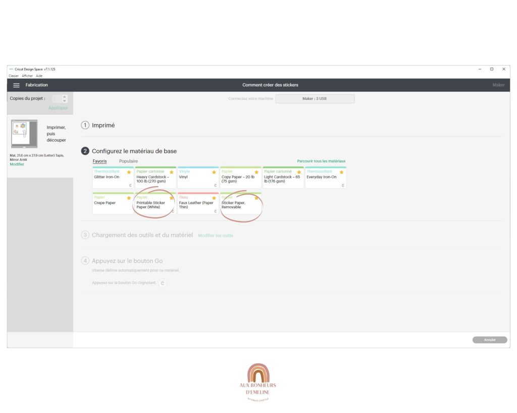 • 2 solutions : soit vous voulez que votre machine découpe la partie collante et la feuille de protection dans ce cas sélectionnez  » Printable stickers paper (white) »