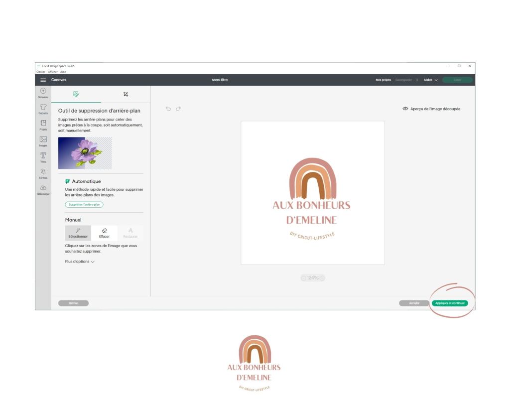 Soit vous utilisez la nouvelle fonction du Design Space, l’outil de suppression de l’arrière plan automatique (uniquement accessibles aux abonnés Cricut Access). J’avoue que cette nouvelle fonction permet de gagner pas mal de temps.